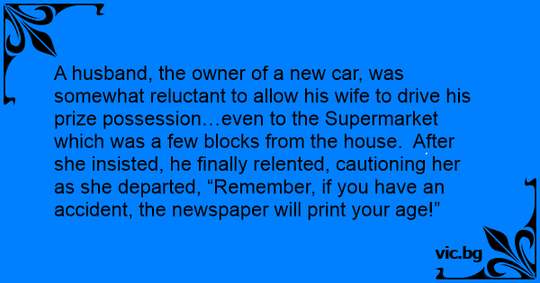 A husband, the owner of a new car, was somewhat reluctant to allow his wife to drive his prize possession…even to the Supermarket which was a few blocks from the house. After she insisted, he finally relented, cautioning her as she departed, “Remember, if you have an accident, the newspaper will print your age!”