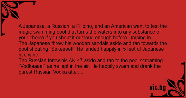 A Japanese, a Russian, a Filipino, and an American went to test the magic swimming pool that turns the waters into any substance of your choice if you shout it out loud enough before jumping in.