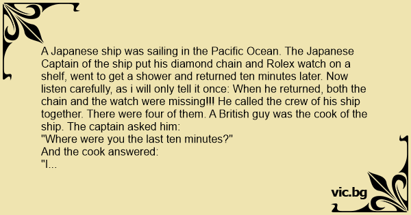 A Japanese ship was sailing in the Pacific Ocean. The Japanese Captain of the ship put his diamond chain and Rolex watch on a shelf, went to get a shower and returned ten minutes later. Now listen carefully, as i will only tell it once: When he returned, both the chain and the watch were missing!!! He called the crew of his ship together. There were four of them. A British guy was the cook of the ship. The captain asked him: