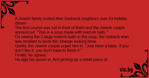 The first course was set in front of them and the Jewish couple announced, "This is a soup made with matzoh ваlls."