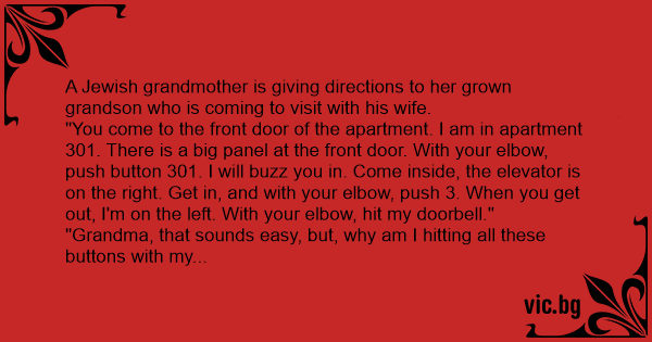 Patrik zve přítele na silvestrovský večírek a vysvětluje: „Dostaneš se k nám autobusem číslo 26, vystoupíš na předposlední stanici a já bydlím hned naproti, v čísle 28. Zazvoníš loktem u branky a...