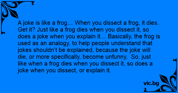 A joke is like a frog… When you dissect a frog, it dies. Get it? Just like a frog dies when you dissect it, so does a joke when you explain it… Basically, the frog is used as an analogy, to help people understand that jokes shouldn’t be explained, because the joke will die, or more specifically, become unfunny. So, just like when a frog dies when you dissect it, so does a joke when you dissect, or explain it.