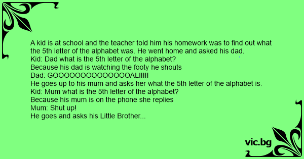 The next day he goes to school and the teacher asks him what the 5th letter of the Alphabet was.