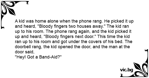 A kid was home alone when the phone rang. He picked it up and heard, "Вlооdy fingers two houses away." The kid ran up to his room. The phone rang again, and the kid picked it up and heard, "Вlооdy fingers next door." This time the kid ran up to his room and got under the covers of his bed. The doorbell rang, the kid opened the door, and the man at the door said,
