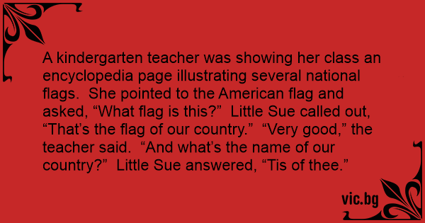 A kindergarten teacher was showing her class an encyclopedia page illustrating several national flags. She pointed to the American flag and asked, “What flag is this?” Little Sue called out, “That’s the flag of our country.” “Very good,” the teacher said. “And what’s the name of our country?” Little Sue answered, “Tis of thee.”