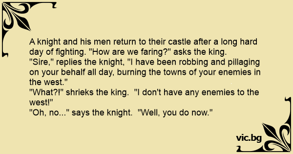 A knight and his men return to their castle after a long hard day of fighting. "How are we faring?" asks the king.
