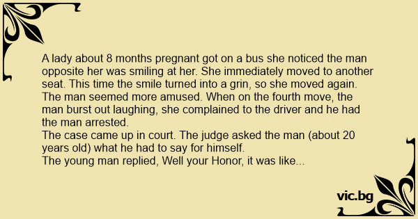 The young man replied, Well your Honor, it was like this: When the lady got on the bus, I couldn't help but notice her condition. She sat down under a sign that said, "The Double Mint Twins are coming" and I grinned.