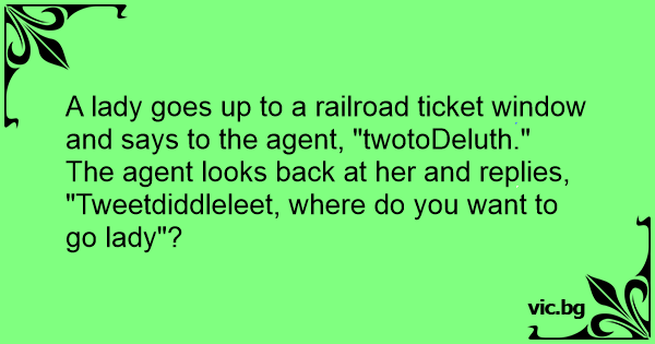 A lady goes up to a railroad ticket window and says to the agent, "twotoDeluth."