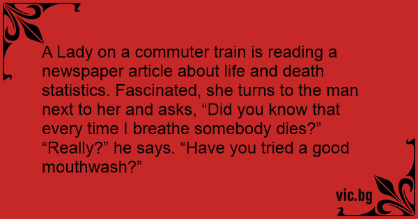 A Lady on a commuter train is reading a newspaper article about life and death statistics. Fascinated, she turns to the man next to her and asks, “Did you know that every time I breathe somebody dies?”