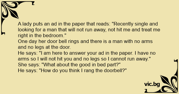 He says: "I am here to answer your ad in the paper. I have no arms so I will not hit you and no legs so I cannot run away."