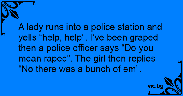 A lady runs into a police station and yells “help, help”. I’ve been graped then a police officer says “Do you mean rареd”. The girl then replies “No there was a bunch of em”.
