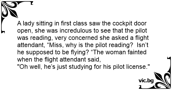 A lady sitting in first class saw the cockpit door open, she was incredulous to see that the pilot was reading, very concerned she asked a flight attendant, “Miss, why is the pilot reading? Isn’t he supposed to be flying? “The woman fainted when the flight attendant said,