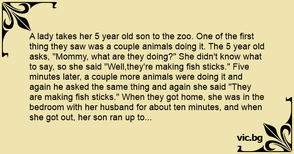 A lady takes her 5 year old son to the zoo. One of the first thing they saw was a couple animals doing it. The 5 year old asks, "Mommy, what are they doing?" She didn't know what to say, so she said "Well,they're making fish sticks." Five minutes later, a couple more animals were doing it and again he asked the same thing and again she said "They are making fish sticks." When they got home, she was in the bedroom with her husband for about ten minutes, and when she got out, her son ran up to her and asked "Mommy, were you in the bedroom making fish sticks with Daddy?" She said,