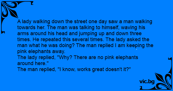 A lady walking down the street one day saw a man walking towards her. The man was talking to himself, waving his arms around his head and jumping up and down three times. He repeated this several times. The lady asked the man what he was doing? The man replied I am keeping the pink elephants away.