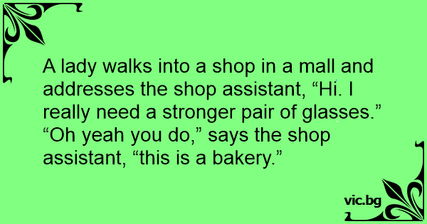 A lady walks into a shop in a mall and addresses the shop assistant, “Hi. I really need a stronger pair of glasses.”