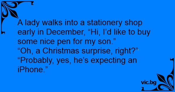 A lady walks into a stationery shop early in December, “Hi, I’d like to buy some nice pen for my son.”