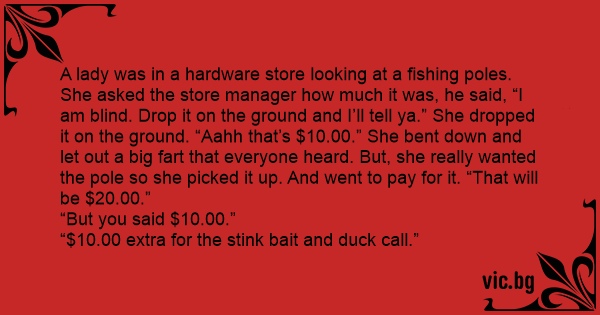 A lady was in a hardware store looking at a fishing poles. She asked the store manager how much it was, he said, “I am blind. Drop it on the ground and I’ll tell ya.” She dropped it on the ground. “Aahh that’s $10.00.” She веnт down and let out a big fаrт that everyone heard. But, she really wanted the pole so she picked it up. And went to pay for it. “That will be $20.00.”