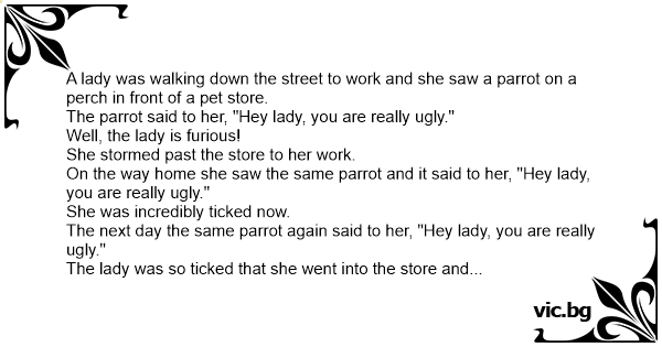 On the way home she saw the same parrot and it said to her, "Hey lady, you are really ugly."