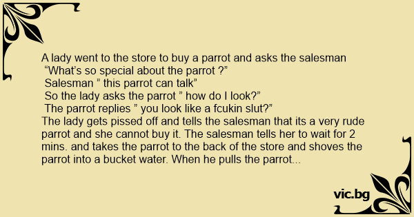 The lady gets рissеd off and tells the salesman that its a very rude parrot and she cannot buy it. The salesman tells her to wait for 2 mins. and takes the parrot to the back of the store and shoves the parrot into a bucket water. When he pulls the parrot out he says “if you disrespect the lady out there ill soak you in water again” and takes the parrot back outside
