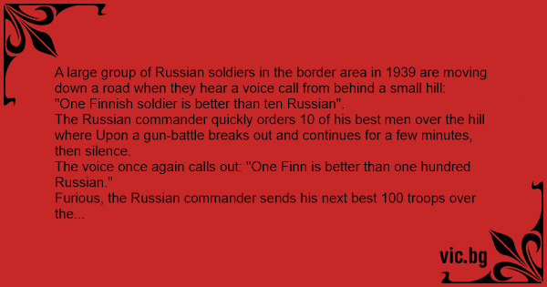 Голяма група руски войници в граничната зона през 1939 г. се движат по пътя, когато чуват глас иззад малък хълм: „Един финландски войник е по-добър от десет руски“. Руският командир бързо...