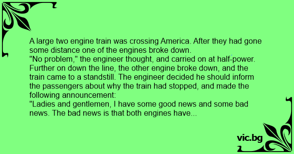 A large two engine train was crossing America. After they had gone some distance one of the engines broke down. "No problem," the engineer thought, and carried on at half-power. Further on down the line, the other engine broke down, and the train came to a standstill. The engineer decided he should inform the passengers about why the train had stopped, and made the following announcement: "Ladies and gentlemen, I have some good news and some bad news. The bad news is that both engines have failed, and we have no power. The good news is that this is a train and not a plane."