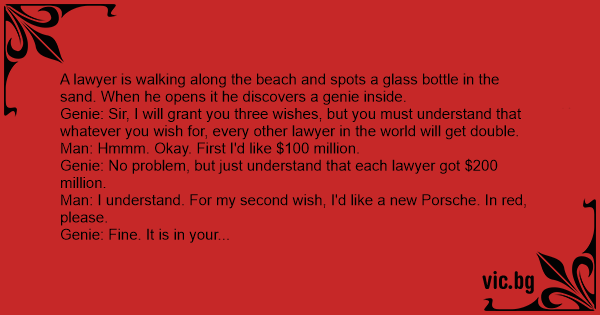 Genie: Sir, I will grant you three wishes, but you must understand that whatever you wish for, every other lawyer in the world will get double.