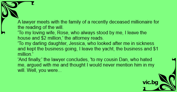 'And finally,' the lawyer concludes, 'to my cousin Dan, who hated me, argued with me and thought I would never mention him in my will. Well, you were wrong. Hi Dan!'