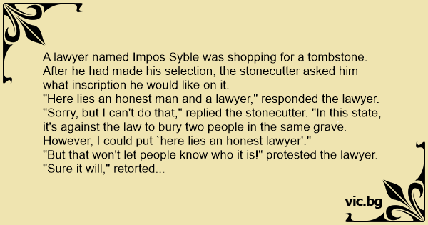 A lawyer named Impos Syble was shopping for a tombstone. After he had made his selection, the stonecutter asked him what inscription he would like on it.
