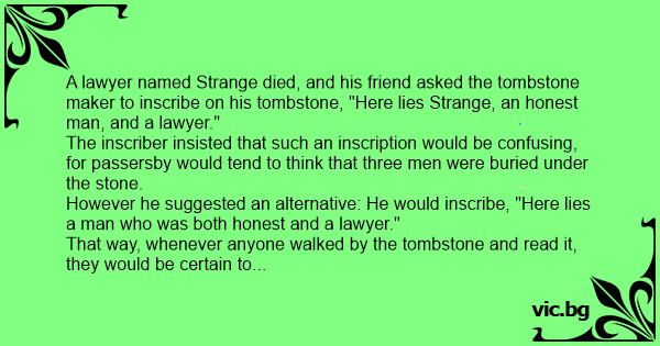 A lawyer named Strange died, and his friend asked the tombstone maker to inscribe on his tombstone, "Here lies Strange, an honest man, and a lawyer."