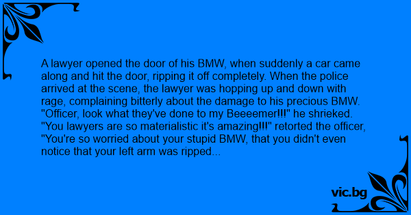 "You lawyers are so materialistic it's amazing!!!" retorted the officer, "You're so worried about your sтuрid BMW, that you didn't even notice that your left arm was ripped off!!!"