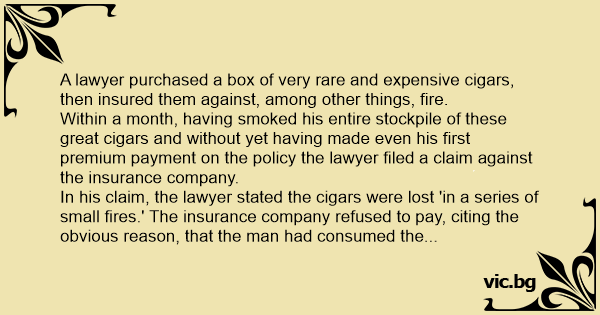 En man från hade köpt en låda sällsynta och väldigt dyra cigarrer och gick därefter till ett försäkringsbolag för att brandförsäkra dem. En månad senare hade han rökt upp hela sitt lager av dessa...