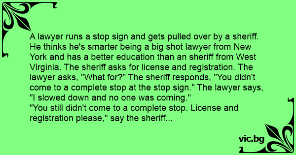 A lawyer runs a stop sign and gets pulled over by a sheriff. He thinks he's smarter being a big shot lawyer from New York and has a better education than an sheriff from West Virginia. The sheriff asks for license and registration. The lawyer asks, "What for?" The sheriff responds, "You didn't come to a complete stop at the stop sign." The lawyer says, "I slowed down and no one was coming."