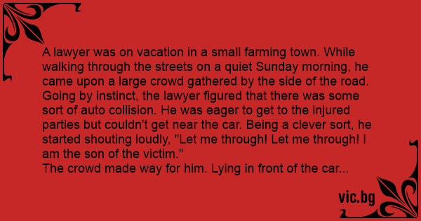 Going by instinct, the lawyer figured that there was some sort of auto collision. He was eager to get to the injured parties but couldn't get near the car. Being a clever sort, he started shouting loudly, "Let me through! Let me through! I am the son of the victim."