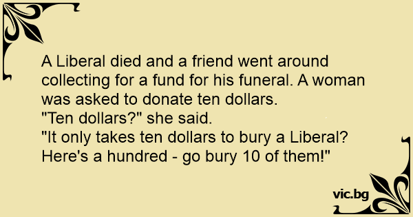 A Liberal died and a friend went around collecting for a fund for his funeral. A woman was asked to donate ten dollars.