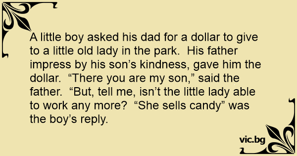A little boy asked his dad for a dollar to give to a little old lady in the park. His father impress by his son’s kindness, gave him the dollar. “There you are my son,” said the father. “But, tell me, isn’t the little lady able to work any more? “She sells candy” was the boy’s reply.