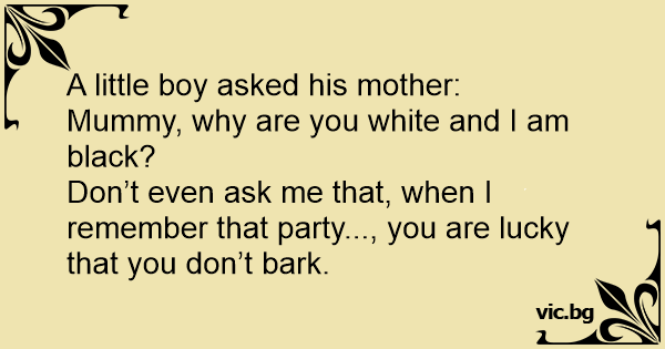 A little boy asks his Mum "why am I black and you are white ?" "Don't even ask," she replies "when I think back to that party... you are lucky that you not bark !"