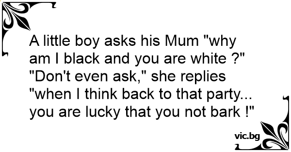 A little boy asked his mother: Mummy, why are you white and I am black? Don’t even ask me that, when I remember that party..., you are lucky that you don’t bark.