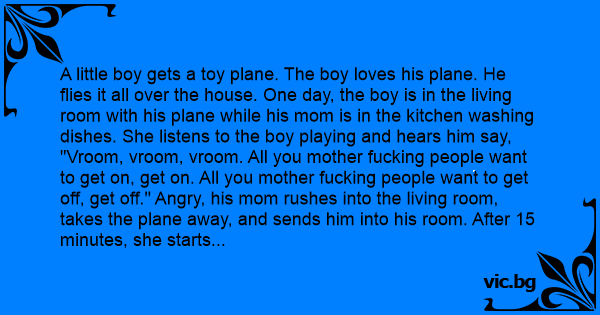 A little boy gets a toy plane. The boy loves his plane. He flies it all over the house. One day, the boy is in the living room with his plane while his mom is in the kitchen washing dishes. She listens to the boy playing and hears him say, "Vroom, vroom, vroom. All you mother fuскing people want to get on, get on. All you mother fuскing people want to get off, get off." Angry, his mom rushes into the living room, takes the plane away, and sends him into his room. After 15 minutes, she starts to feel bad and tells the boy, "If you don't use that kind of language, you can play with your plane." The boy returns to the living room, his mom to the kitchen. She listens again to the boy playing, she hears him say, "Vroom, vroom, vroom. All you very nice people want to get on, get on. All you very nice people want to get off, get off. If you have a problem with 15 minute delay, you can go talk to the вiтсh in the kitchen!"