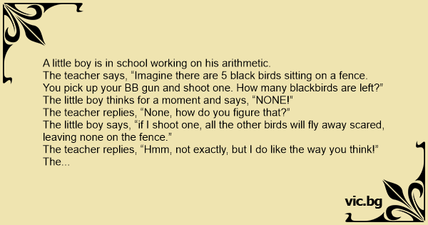 The teacher says, “Imagine there are 5 black birds sitting on a fence. You pick up your BB gun and shoot one. How many blackbirds are left?”