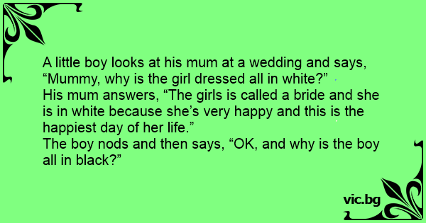 Мамо, ги гледав сликите од вашата свадба со тато и сакам да те прашам зошто носиш бел фустан? Мајката: Зошто белата боја е боја на радоста. Детето: А тогаш зошто тато е во црно?!
