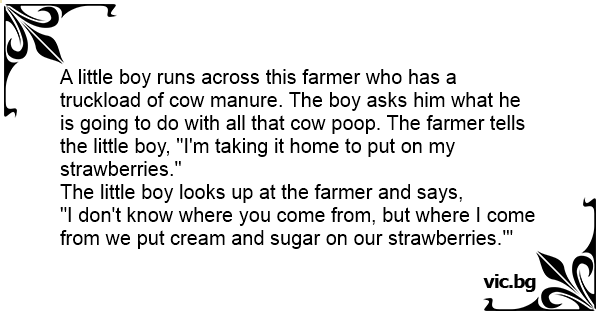 A little boy runs across this farmer who has a truckload of соw manure. The boy asks him what he is going to do with all that соw роор. The farmer tells the little boy, "I'm taking it home to put on my strawberries."