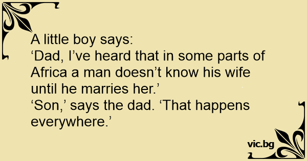 – Är det sant, pappa, att i vissa delar av Afrika känner inte mannen sin hustru innan de gift sig? – Så är det i alla länder, min son.
