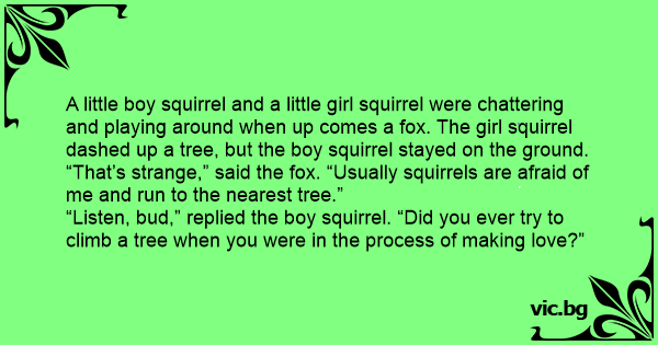 A little boy squirrel and a little girl squirrel were chattering and playing around when up comes a fox. The girl squirrel dashed up a tree, but the boy squirrel stayed on the ground. “That’s strange,” said the fox. “Usually squirrels are afraid of me and run to the nearest tree.” “Listen, bud,” replied the boy squirrel. “Did you ever try to climb a tree when you were in the process of making love?”