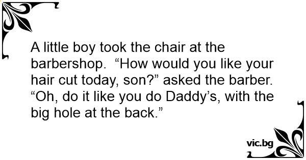 A little boy took the chair at the barbershop. “How would you like your hair cut today, son?” asked the barber. “Oh, do it like you do Daddy’s, with the big hole at the back.”