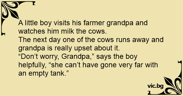 “Don’t worry, Grandpa,” says the boy helpfully, “she can’t have gone very far with an empty tank.”