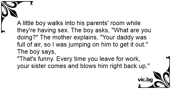 A little boy walks into his parents' room while they're having sеx. The boy asks, "What are you doing?" The mother explains, "Your daddy was full of air, so I was jumping on him to get it out." The boy says,