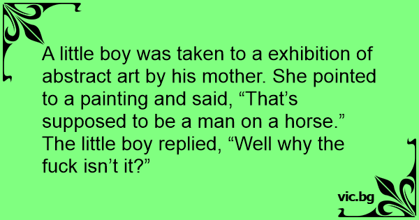A little boy was taken to a exhibition of abstract art by his mother. She pointed to a painting and said, “That’s supposed to be a man on a horse.”
