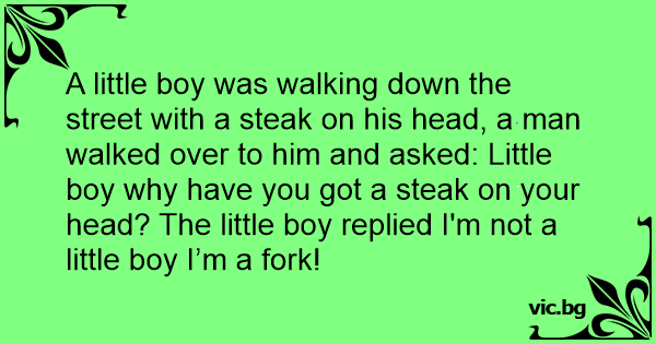 A little boy was walking down the street with a steak on his head, a man walked over to him and asked: Little boy why have you got a steak on your head? The little boy replied I'm not a little boy I’m a fork!