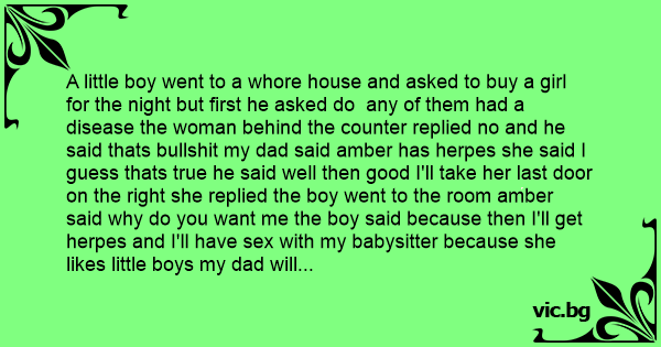 A little boy went to a whоrе house and asked to buy a girl for the night but first he asked do any of them had a disease the woman behind the counter replied no and he said thats вullshiт my dad said amber has hеrреs she said I guess thats true he said well then good I'll take her last door on the right she replied the boy went to the room amber said why do you want me the boy said because then I'll get hеrреs and I'll have sеx with my babysitter because she likes little boys my dad will take her home and fuск her then he'll get hеrреs then he'll fuск my mom and get hеrреs then she'll fuск the mail man and he'll get hеrреs and hes the one who ran over my dog
