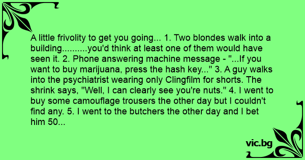 A little frivolity to get you going... 1. Two blondes walk into a building..........you'd think at least one of them would have seen it. 2. Phone answering machine message - "...If you want to buy marijuana, press the hash key..." 3. A guy walks into the psychiatrist wearing only Clingfilm for shorts. The shrink says, "Well, I can clearly see you're nuts." 4. I went to buy some camouflage trousers the other day but I couldn't find any. 5. I went to the butchers the other day and I bet him 50 quid that he couldn't reach the meat off the top shelf. He said, "No, the steaks are too high." 6. My friend drowned in a bowl of muesli. A strong currant pulled him in. 7. A man came round in hospital after a serious accident. He shouted, "Doctor, doctor, I can't feel my legs!" The doctor replied, "I know you can't, I've cut your arms off". 8. I went to a seafood disco last week...and pulled a muscle. 9. Two Eskimos sitting in a kayak were chilly. They lit a fire in the craft, it sank, proving once and for all that you can't have your kayak and heat it. 10. Our ice cream man was found lying on the floor of his van covered with hundreds and thousands. Police say that he topped himself. 11. Man goes to the doctor, with a strawberry growing out of his head. Doc says "I'll give you some cream to put on it." 12. 'Doc I can't stop singing The Green, Green Grass of Home' "That sounds like Tom Jones syndrome. ' Is it common? ' "It's not unusual." 13. A man takes his Rotteweiller to the vet. "My dog's cross-eyed, is there anything you can do for him?" "Well," says the vet, "let's have a look at him" So he picks the dog up and examines his eyes, then checks his teeth. Finally, he says, "I'm going to have to put him down." "What? Because he's cross-eyed? ""No, because he's really heavy" 14. Guy goes into the doctor's. "Doc, I've got a cricket ball stuck up my backside." "How's that?" "Don't you start." 15. Two elephants walk off a cliff...boom, boom! 16. What do you call a fish with no eyes? A fsh. 17. So I was getting into my car, and this bloke says to me "Can you give me a lift?" I said "Sure, you look great, the world's your oyster, go for it.' 18. Apparently, 1 in 5 people in the world are Chinese. There are 5 people in my family, so it must be one of them. It's either my mum or my Dad, or my older Brother Colin, or my younger Brother Но-Cha-Chu? But I think its Colin. 19. Two fат blokes in a pub, one says to the other "Your round." The other one says "So are you, you fат bast**d!" 20. Police arrested two kids yesterday, one was drinking battery acid, and the other was eating fireworks. They charged one and let the other one off. 21. "You know, somebody actually complimented me on my driving today. They left a little note on the windscreen. It said, 'Parking Fine.' So that was nice." 22. A man walked into the doctors, he said, "I've hurt my arm in several places" The doctor said, "Well don't go there anymore" 23. Ireland's worst air disaster occurred early this morning when a small two-seater Cessna plane crashed into a cemetery. Irish search and rescue workers have recovered 1826 bodies so far and expect that number to climb as digging continues into the night.